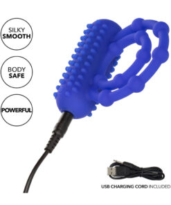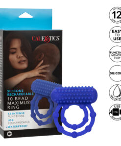 Double your pleasure when you slip on the Silicone Rechargeable 10 Bead Maximus Ring. This stretchy ring is lined with daring pleasure beads and topped with a nubbed teaser that shakes to the rhythm of 12 functions of vibration. The plush body-safe silicone ring works to improve stamina and girth to make your lover moan for more, more, more.