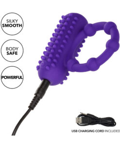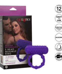 Double your pleasure when you slip on the Silicone Rechargeable 5 Bead Maximus Ring. This stretchy ring is lined with daring pleasure beads and topped with a nubbed teaser that shakes to the rhythm of 12 functions of vibration.