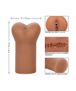 Life-like Pure Skin material. Soft, tight and stretchy. Multi-textured chamber for endless satisfaction. Closed-ended for superior suction. Hygienically superior and maintenance-free. 3x3x5.5 Inches.