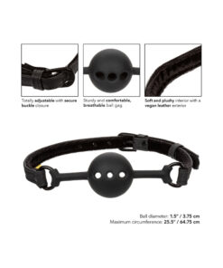 Surrender to your naughtiest fantasies as you secure the pliable silicone ball gag, designer vegan leather straps, and adjustable buckle closure.
