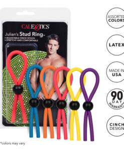 Maximize your sensual performance and stamina with Julian’s Stud Ring. The fully adjustable erection keeper is designed to extend and enhance your sensuous pleasure, for unlimited mind-blowing explosions. The soft lasso-shaped enhancer comfortably slips over the erect penis for instant arousal, stimulation, and support. To find the perfect fit, simply adjust the toggle and get ready to enjoy indulgent ecstasy.