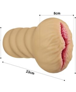 The designed textured tunnel on the inside features lateral ridges, bumps and nubs throughout the whole length which mimics the texture of a vagina. The masturbator is easy to clean, simply flush the channel directly with running water and wipe the masturbator dry.
