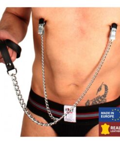 A pleasure increased by the presence of the leash consisting of a metal chain of 40cm. The partner then stretches both nipples.
