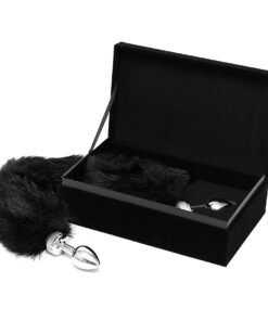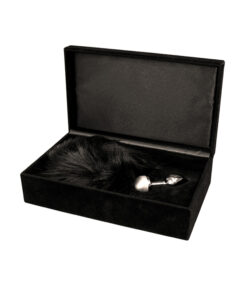 Small smooth stainless steel anal plug with a long black bushy faux tail, all in a black presentation box.